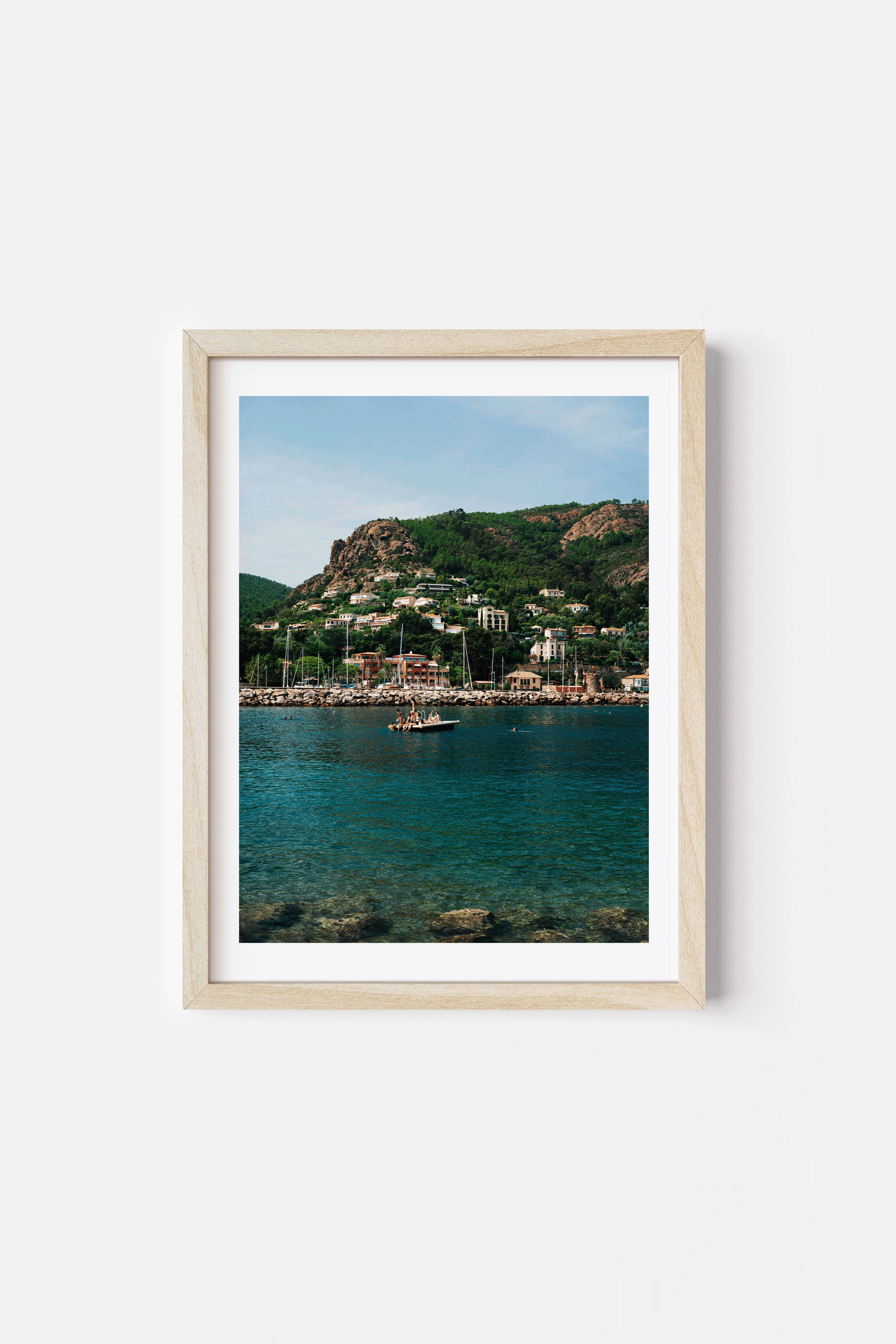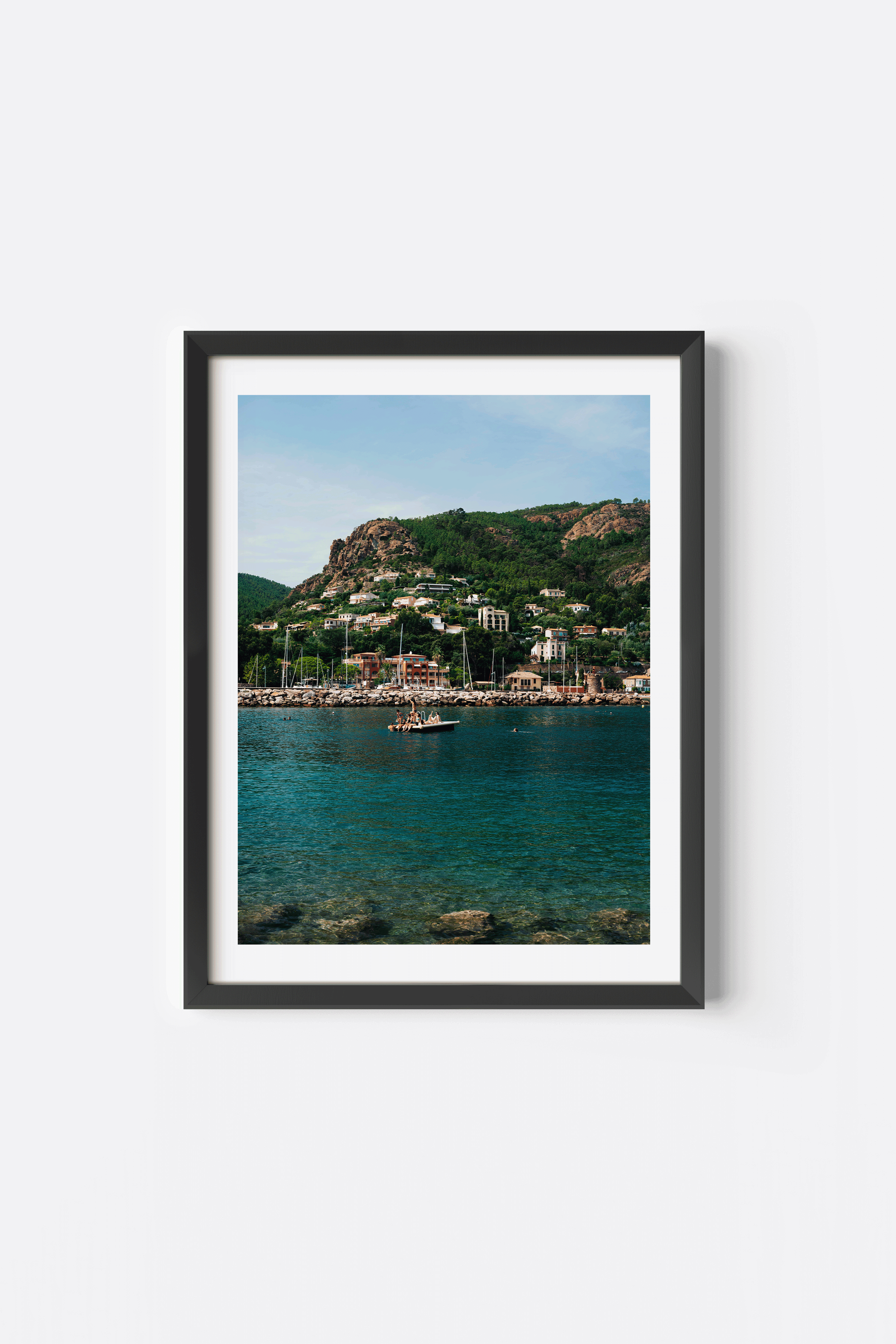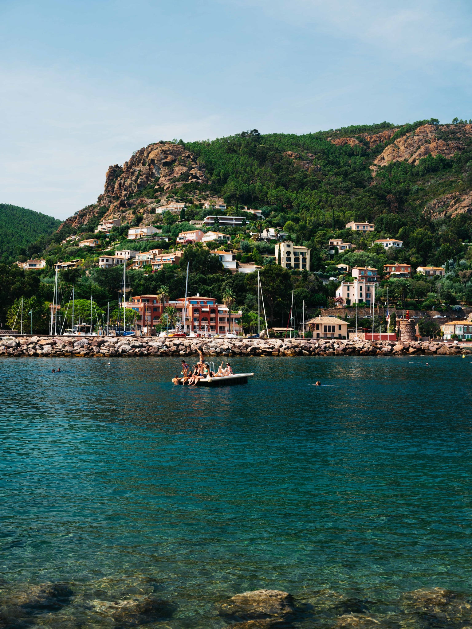 People of all ages gather by the water in the Bay of Cannes. Terra cotta homes sit against the lush green hillside, while clear turquoise water reveals the rocks beneath the surface.