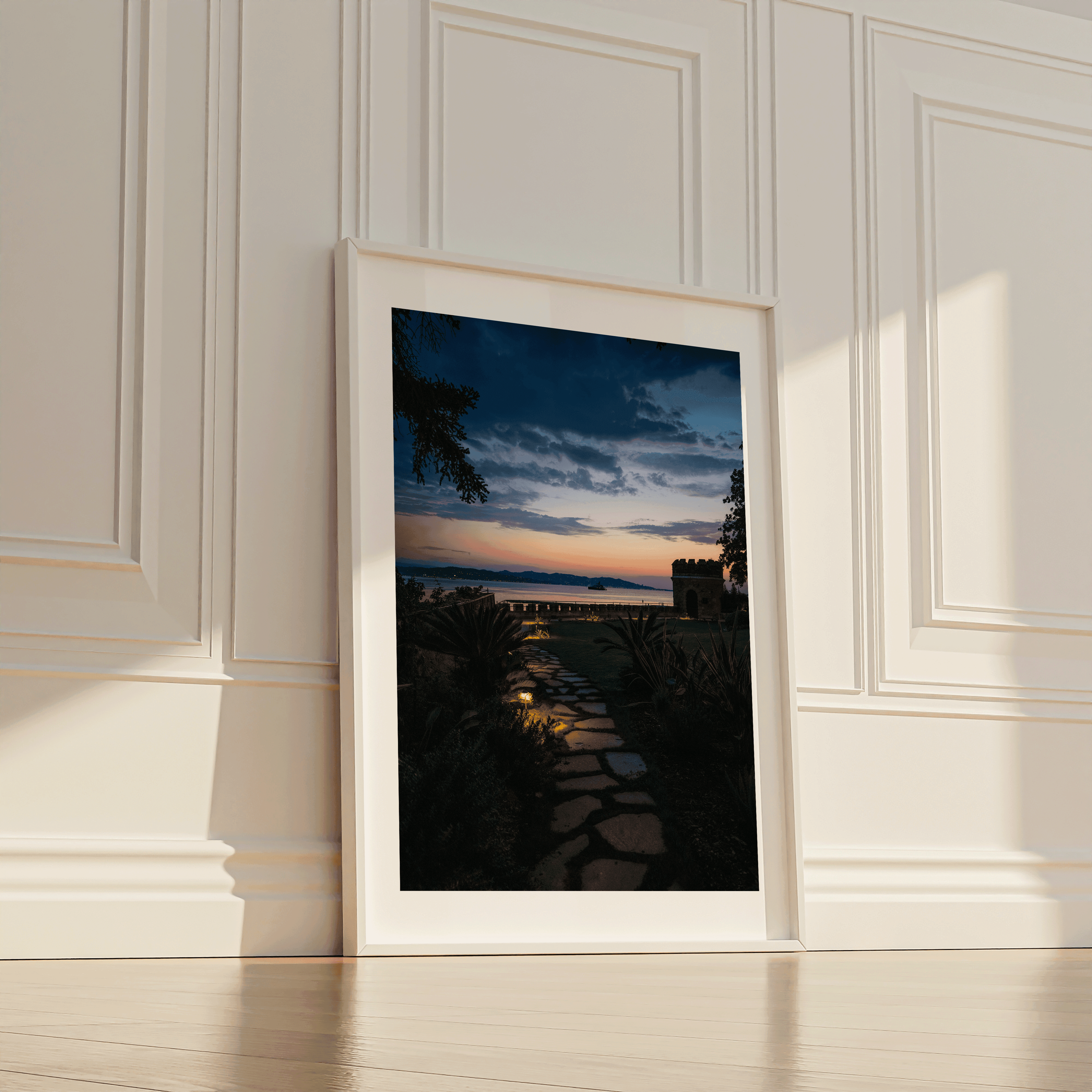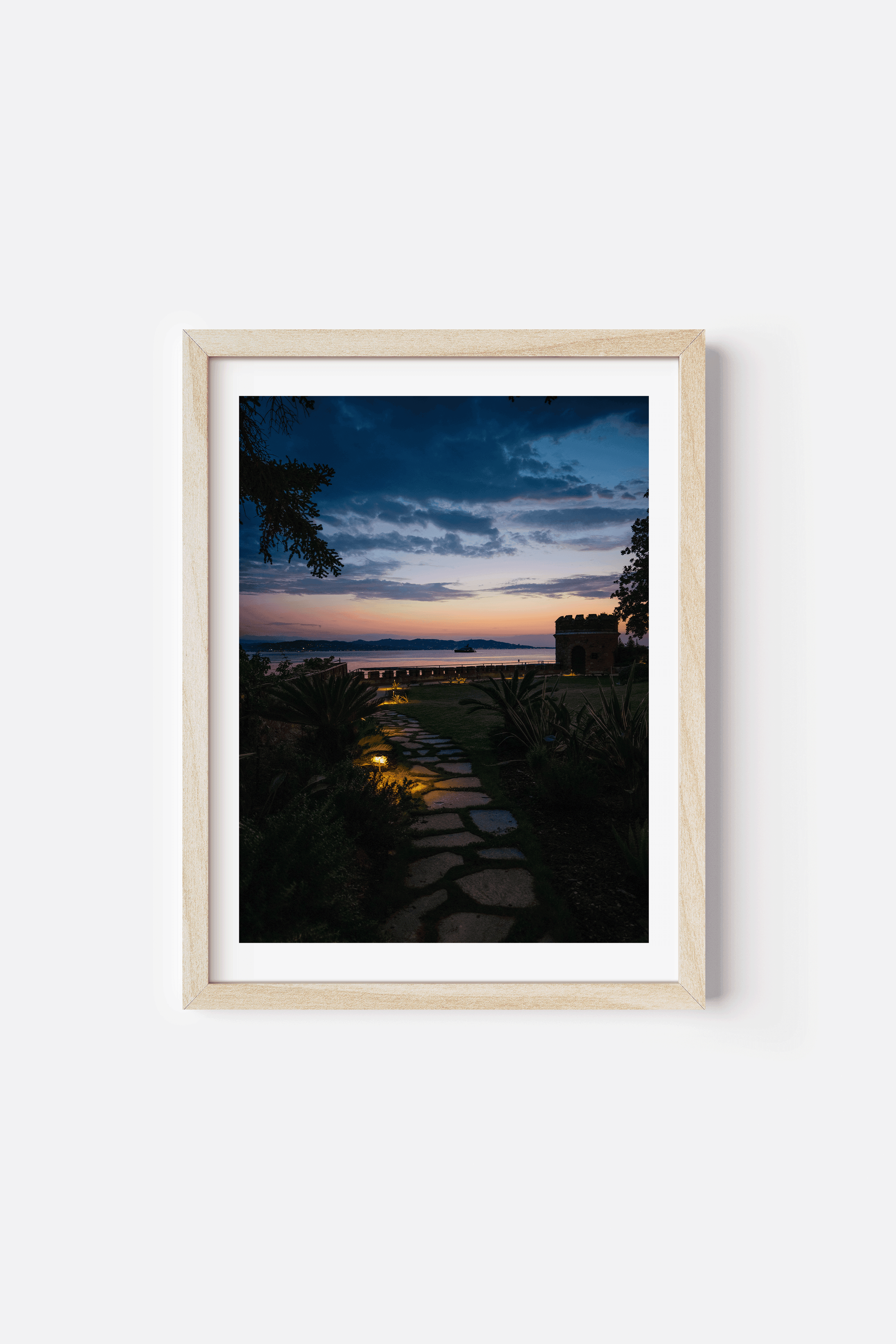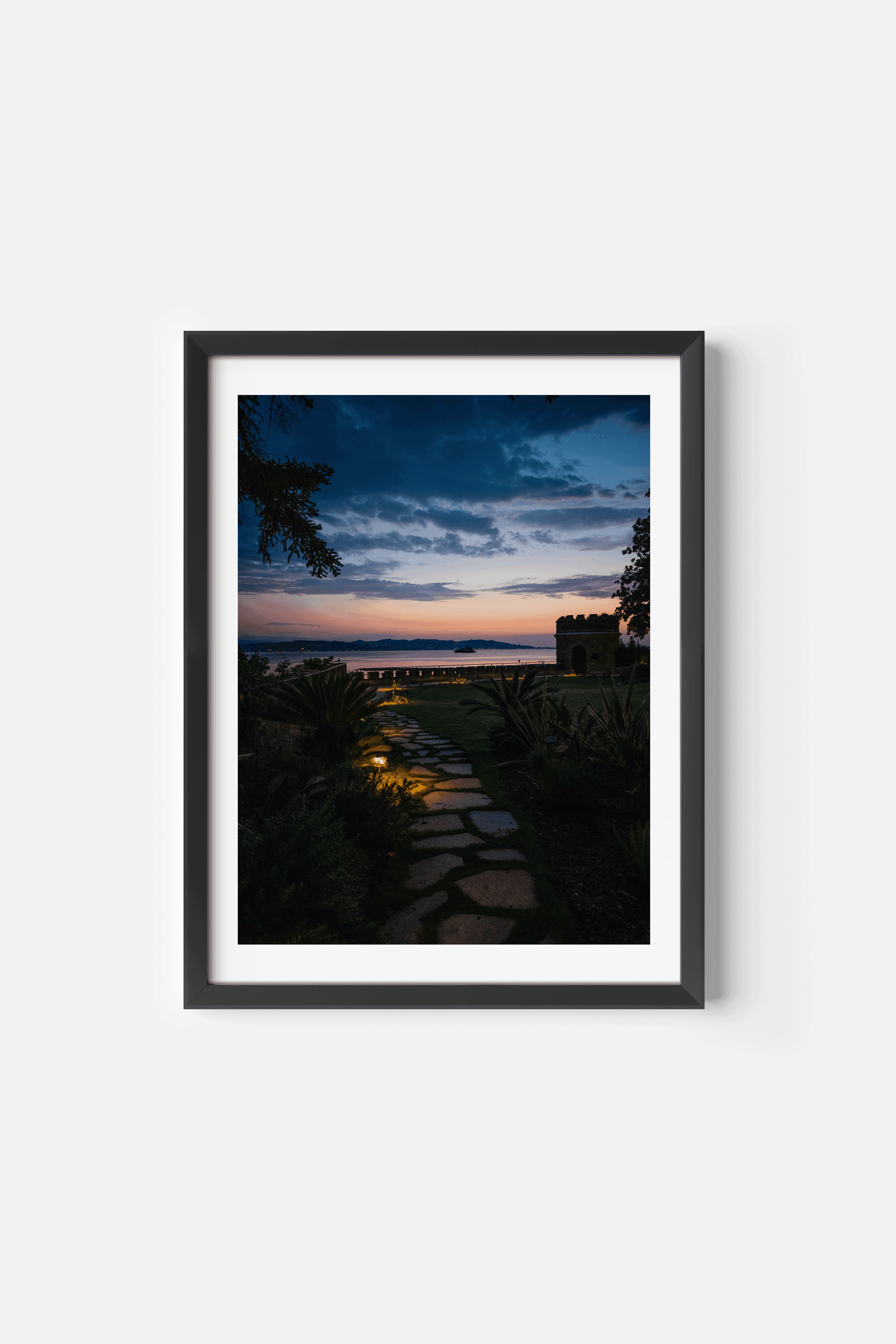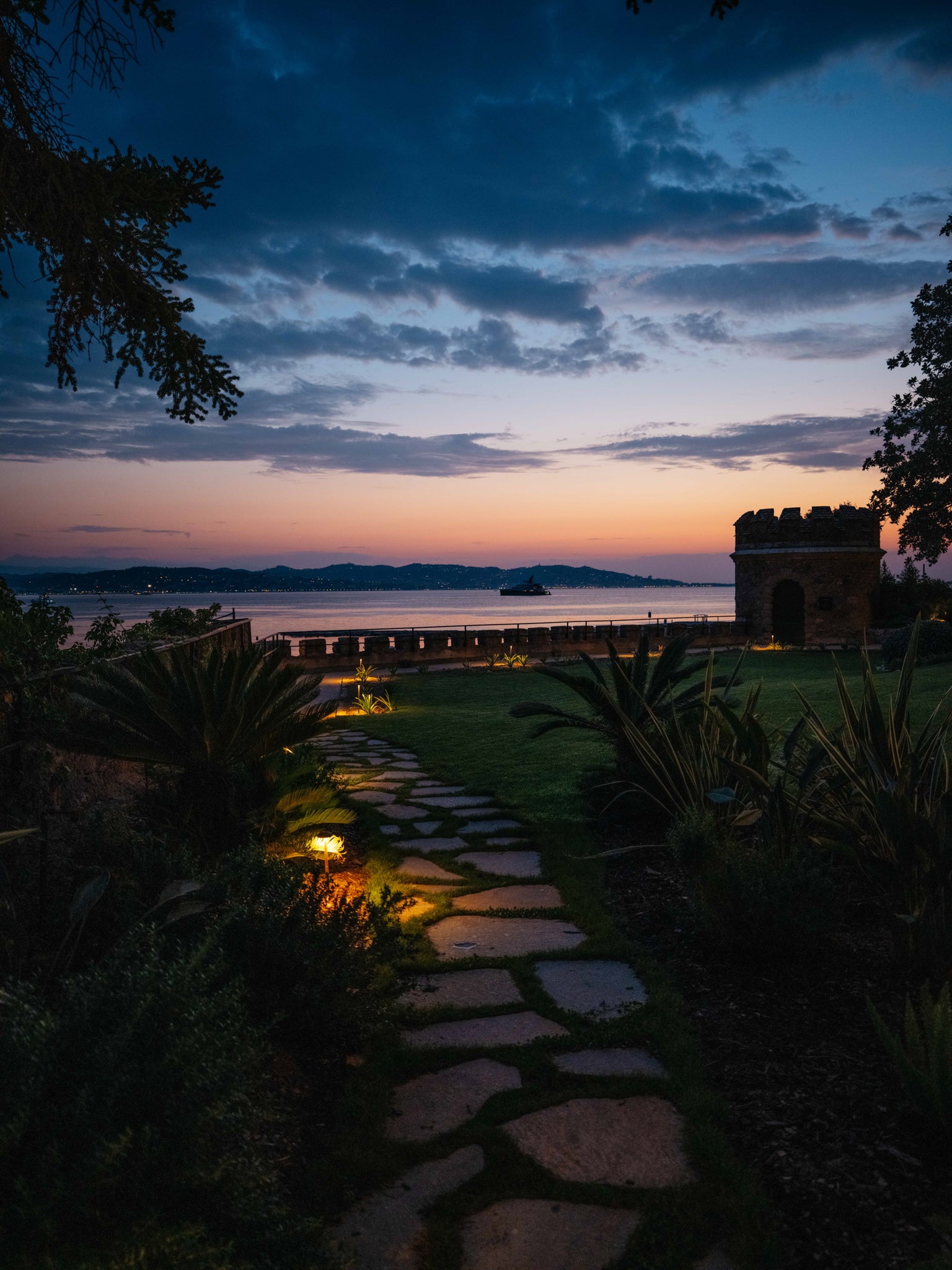 5:30am dawn breaks at the Château. The pathway toward the private bay is dimly lit.