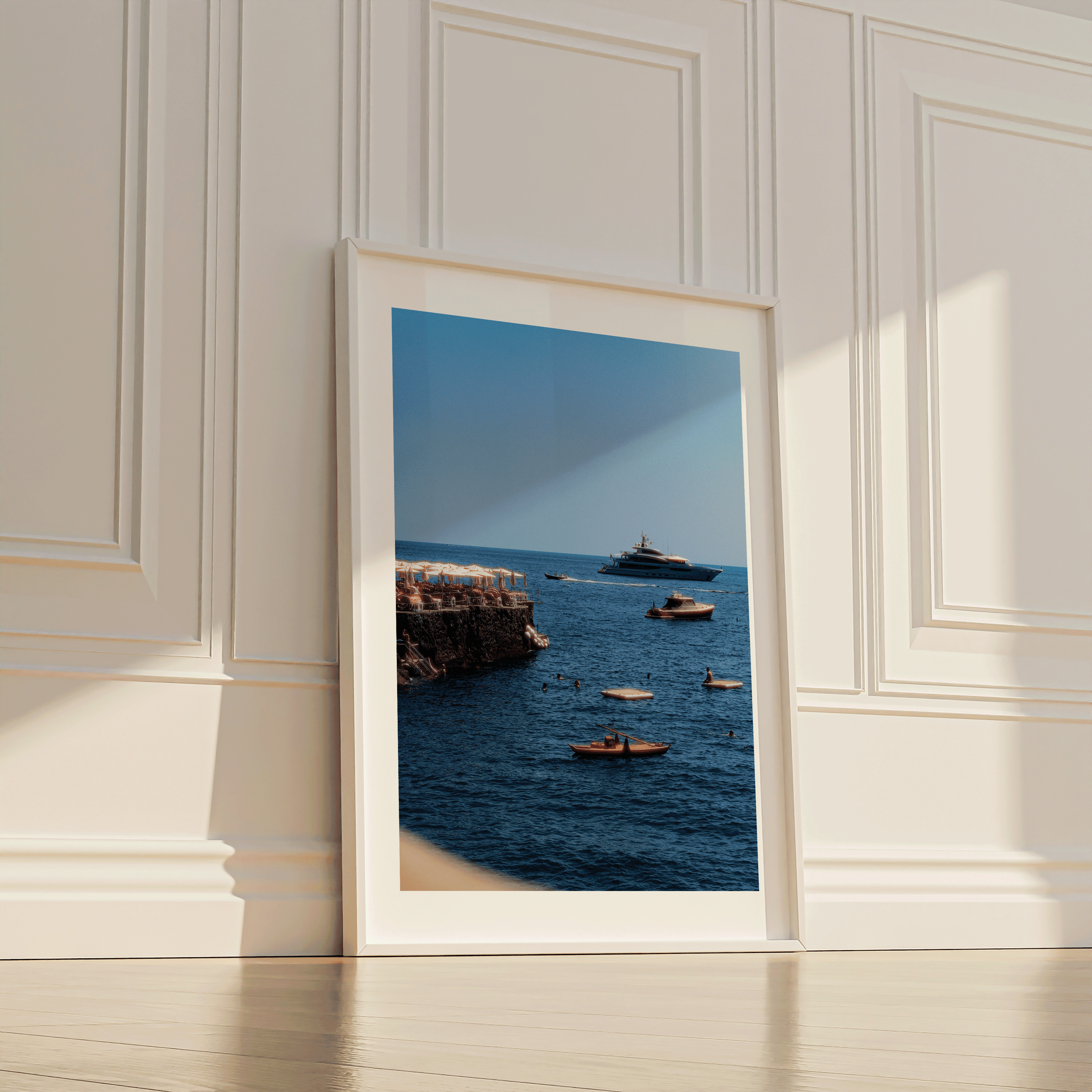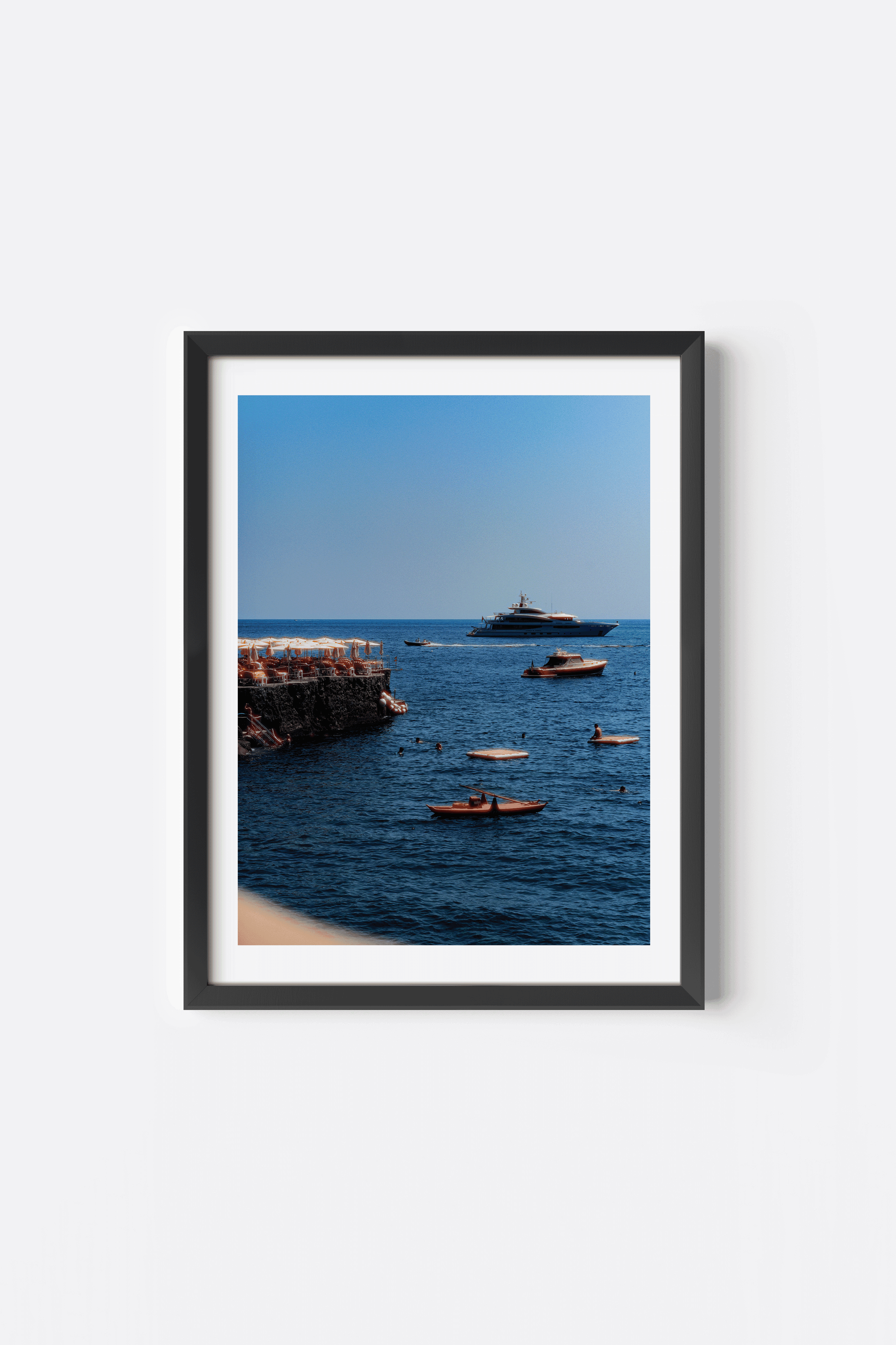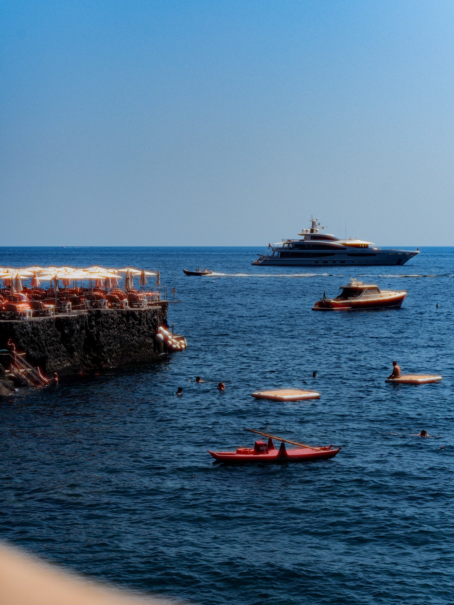 Bright umbrellas. Swimmers resting in the water, yachts, and the Amalfi coast extending into the horizon. The scene captures the spirit of Italian summer.