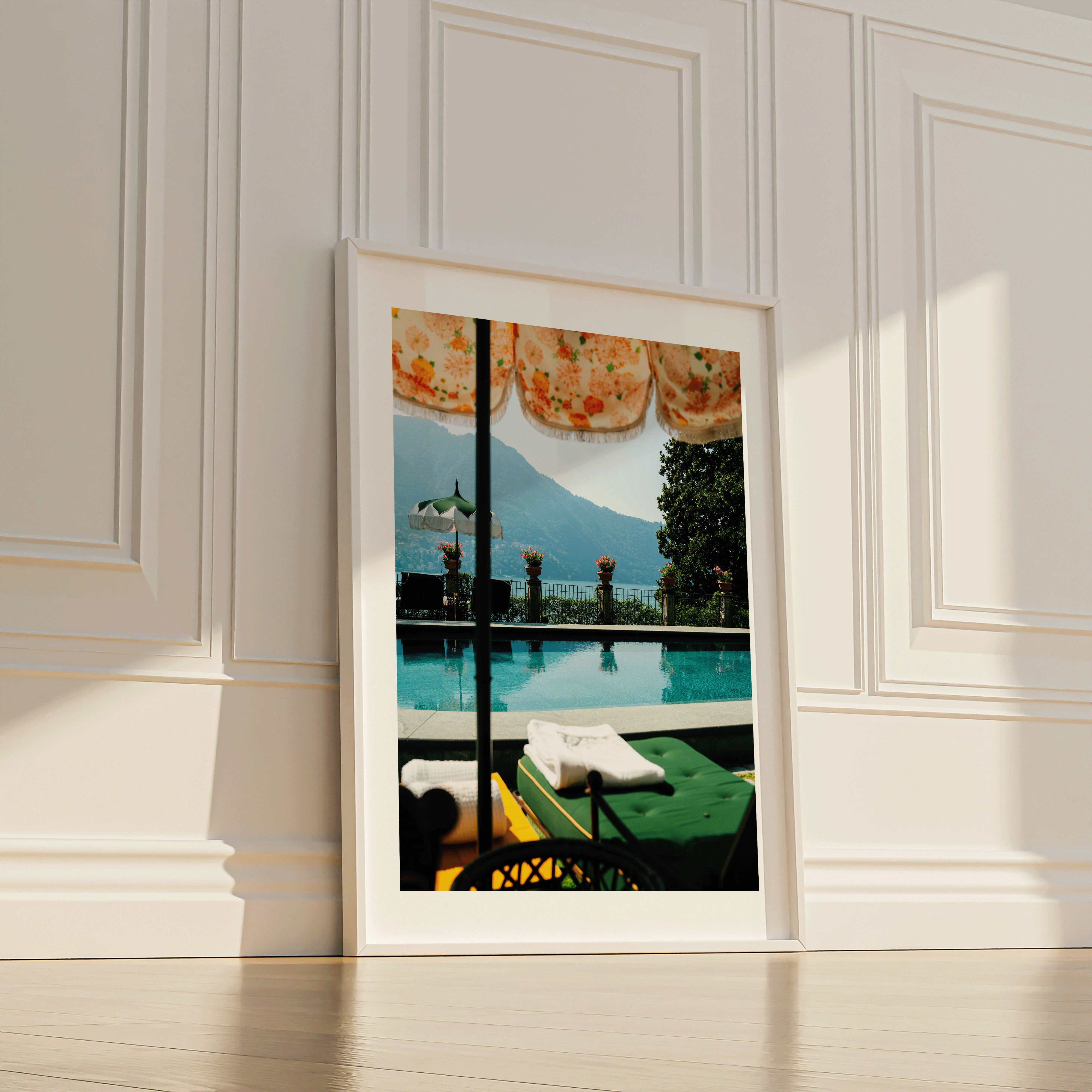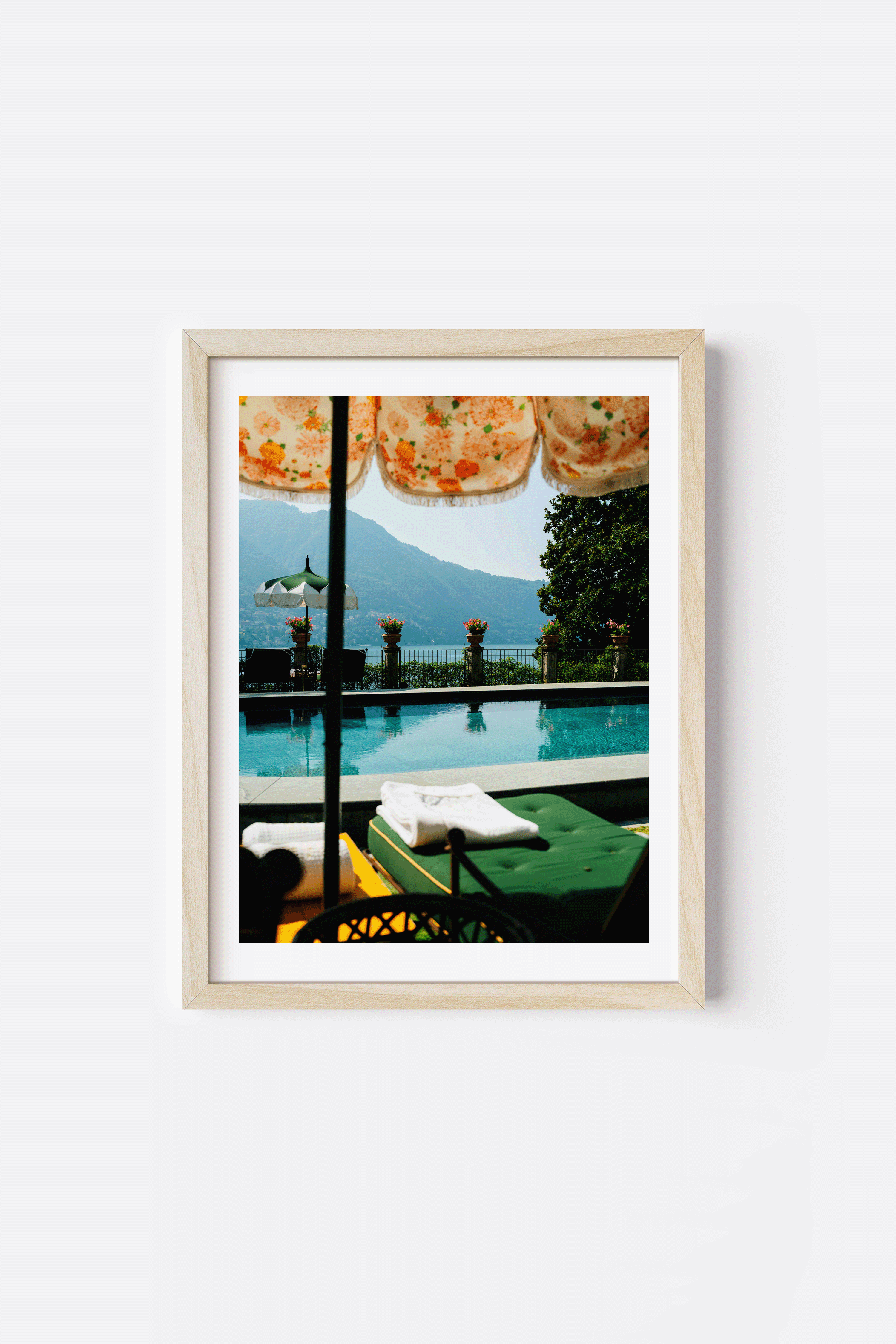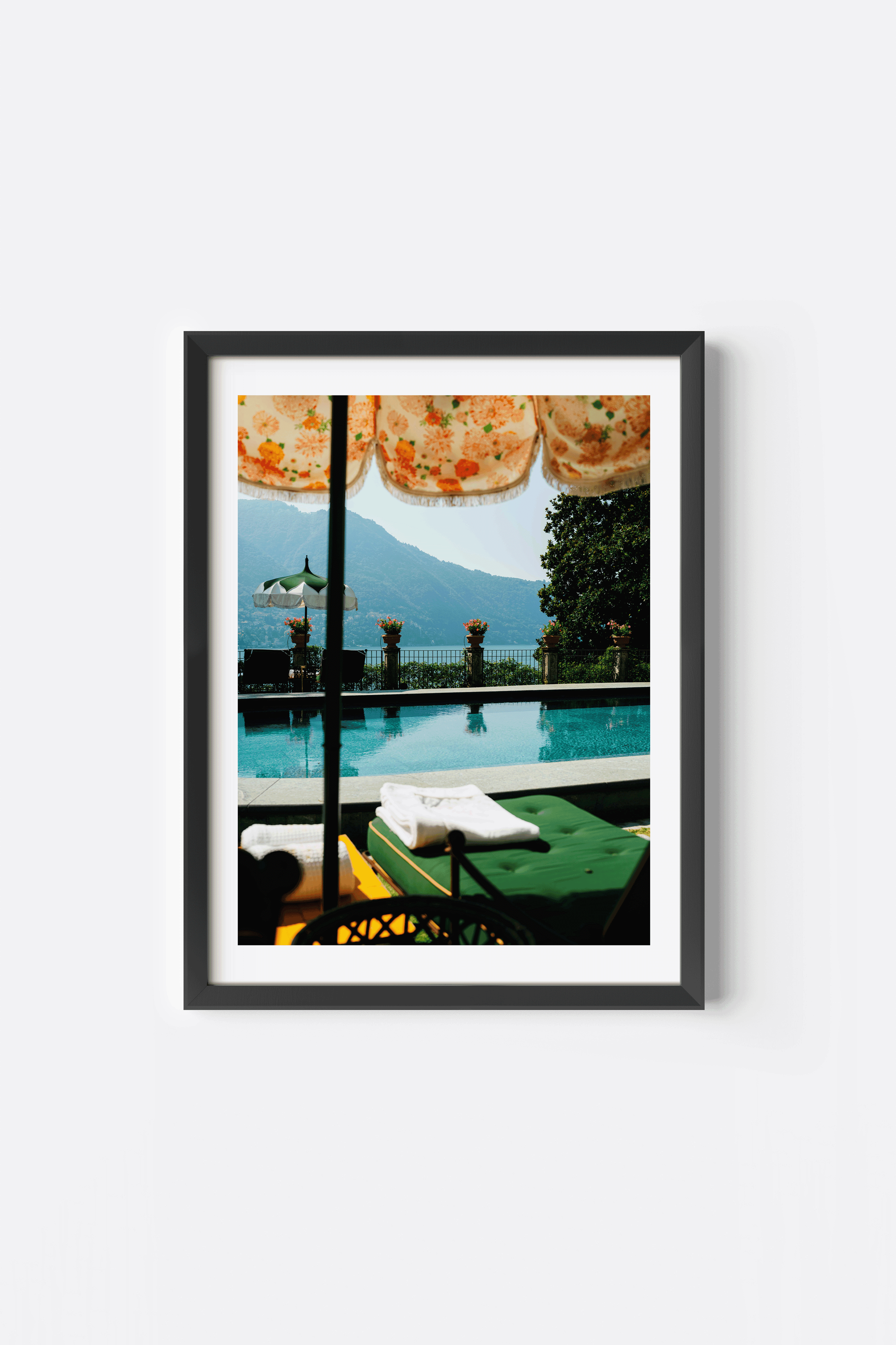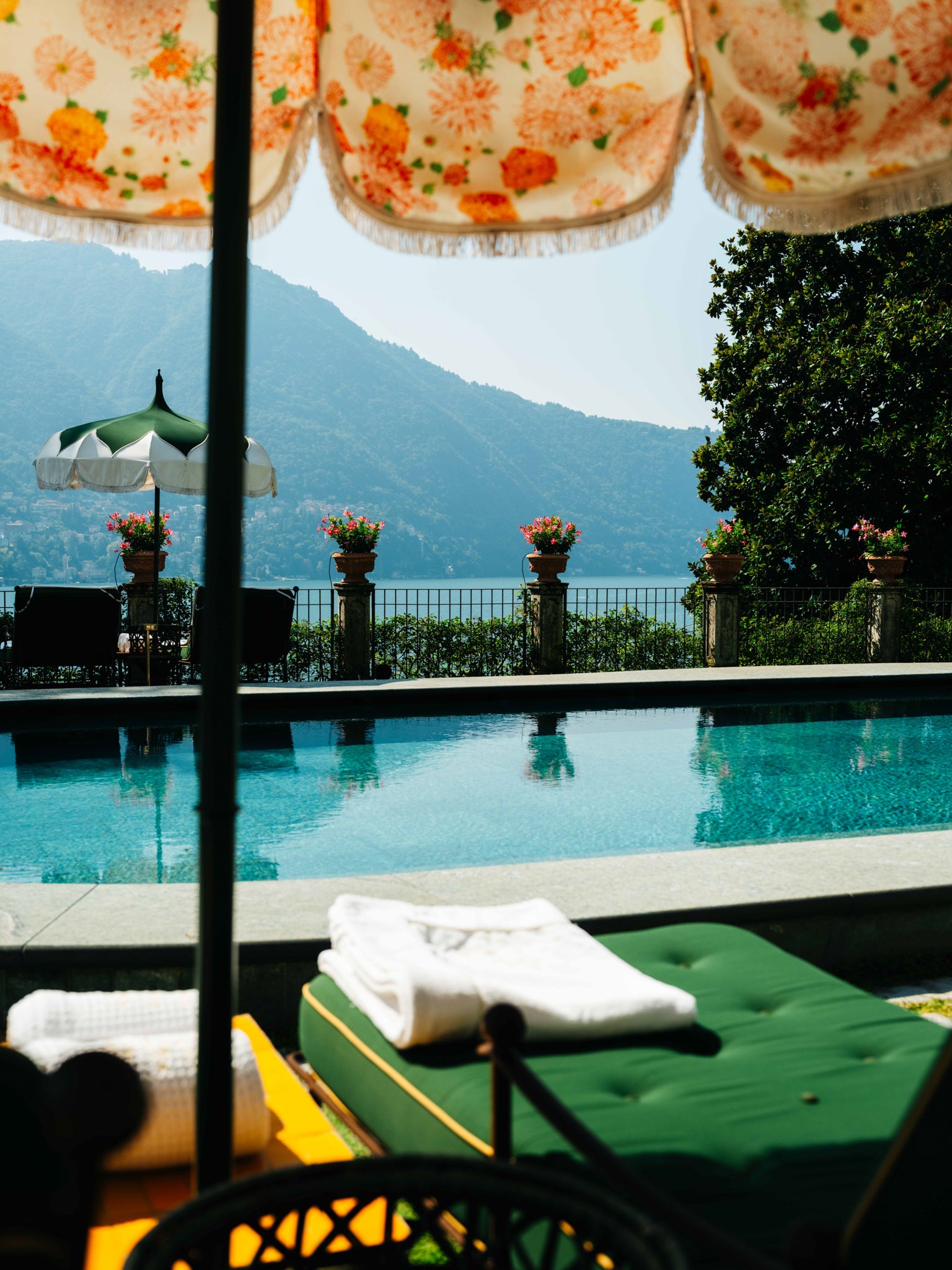 A poolside point of view captures Lake Como at its finest - decorative Italian umbrellas, flowers lining the terrace, and water stretching toward the mountain.